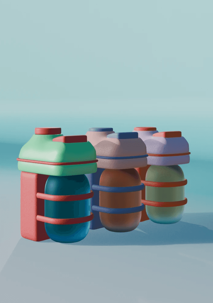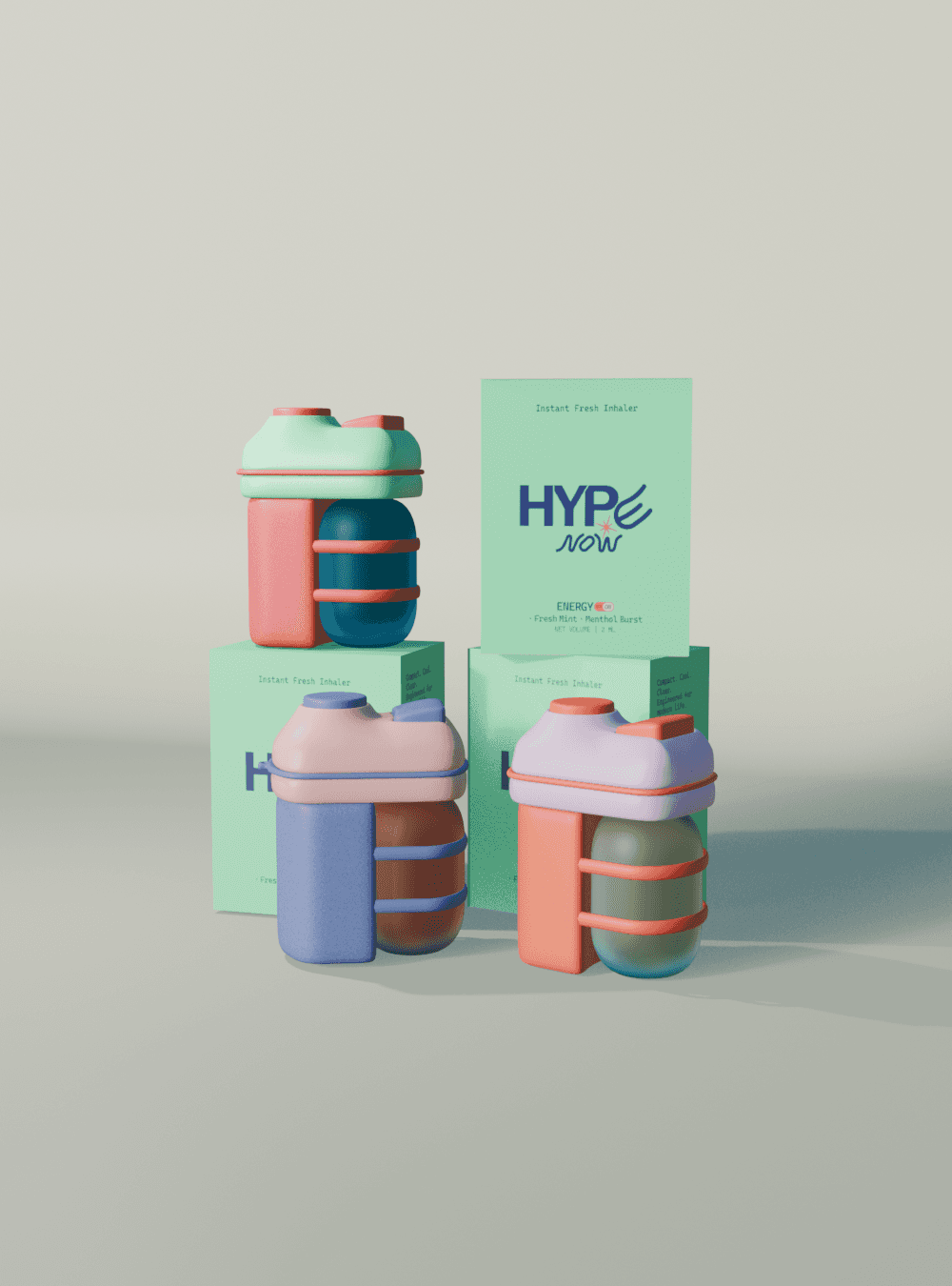 A stylized 3D product and packaging scene. The packaging was designed in Illustrator/Photoshop